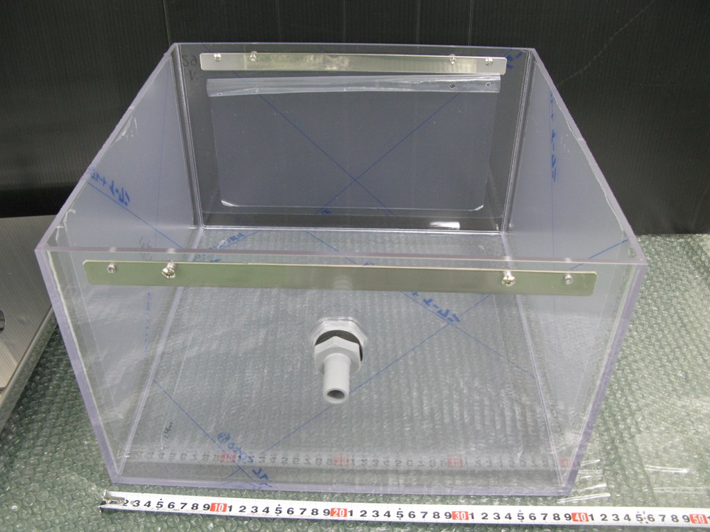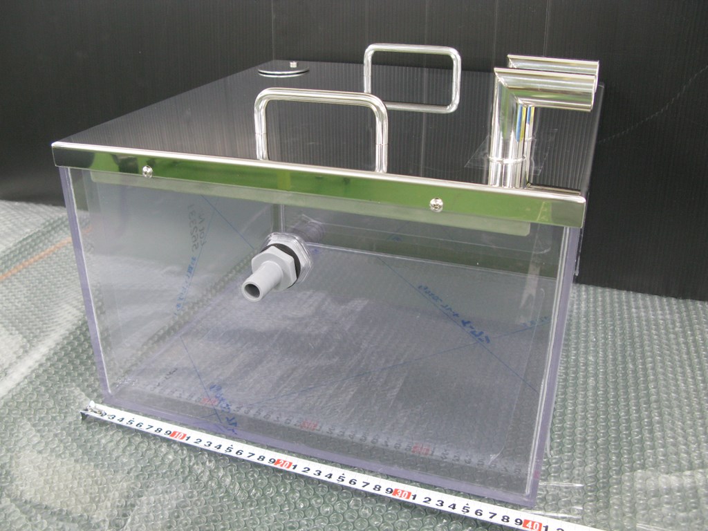お客様からのご要望の、水量が見えること、見栄えがいいこと、排水ホースの取付易くすることを検討し、要望を満たす形状を考えて設計~製作までを行いました。